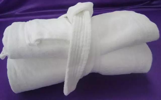 浴袍折疊首先將衣服平鋪后,向后折疊,取衣服兩側縫合線鋪平,然后豎向對折,取1/3折疊2次,橫向扎起打結即可,店徽正面露出。
